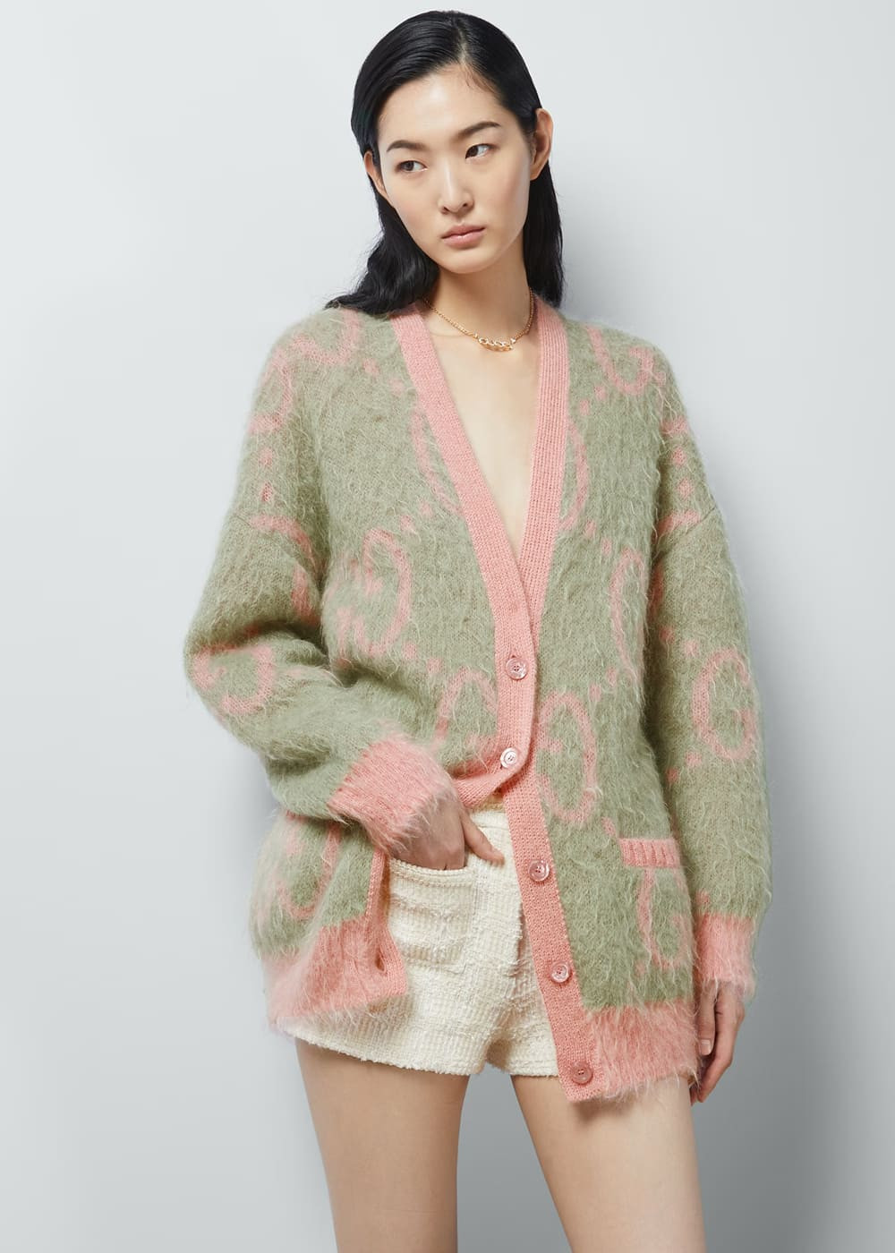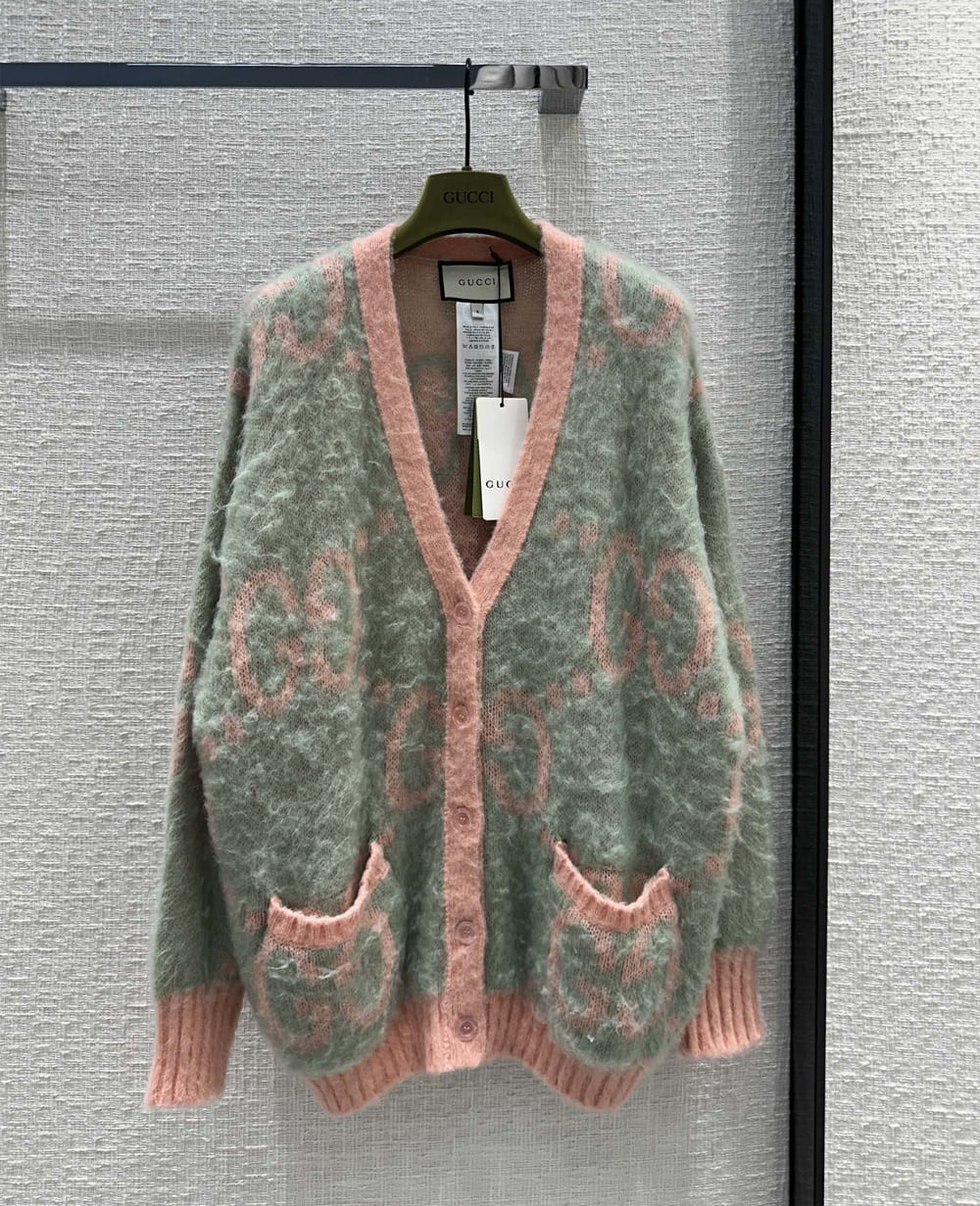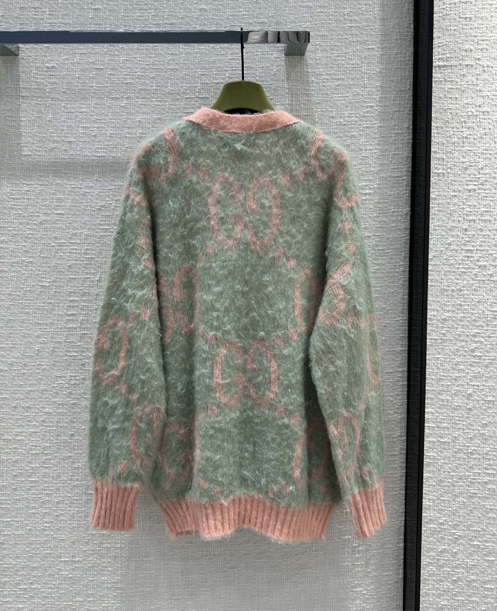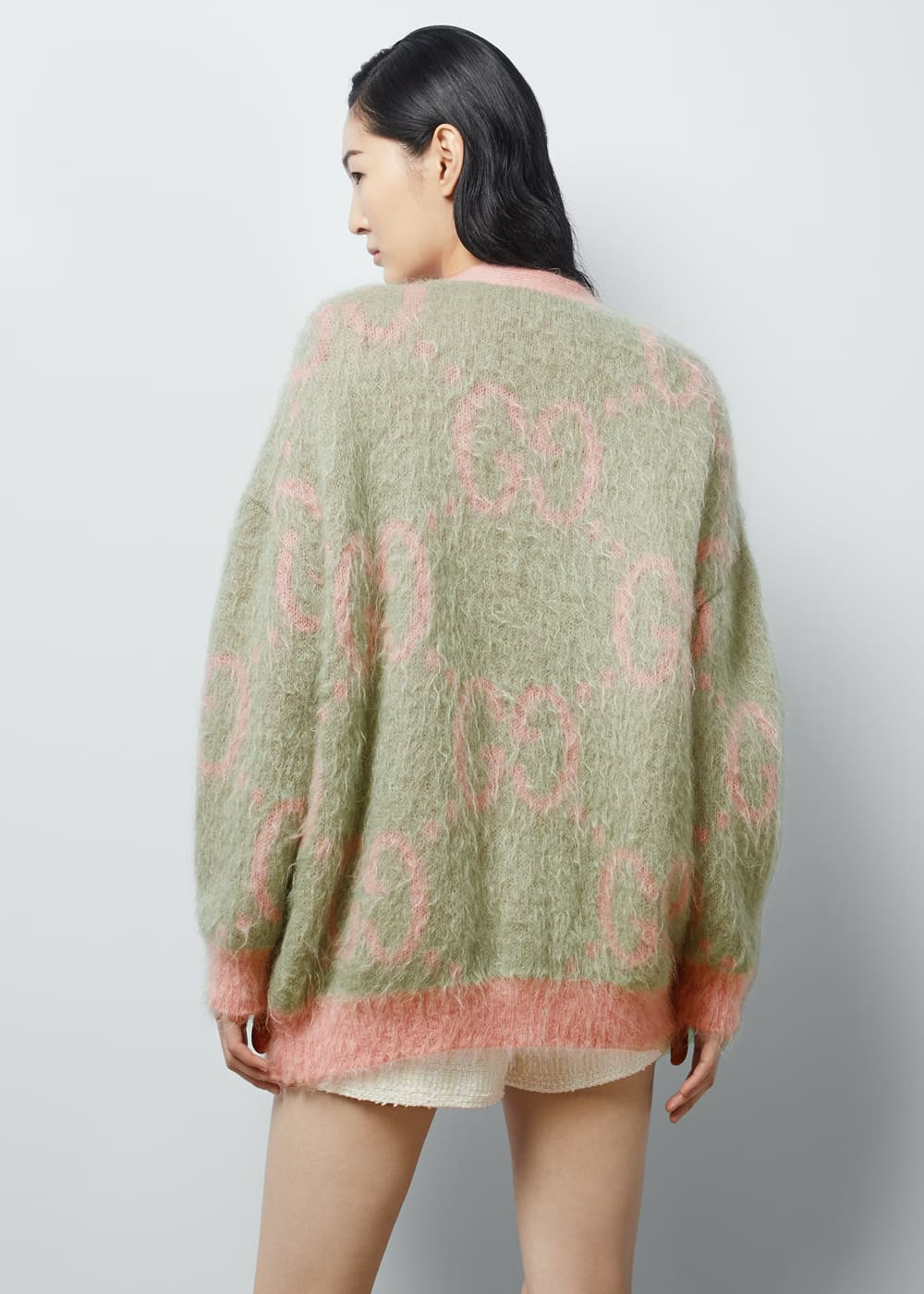 Gucci Reversible GG Mohair Wool Cardigan In Light Green & Pink 635160