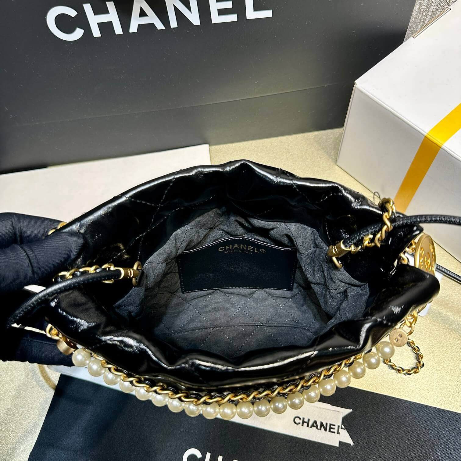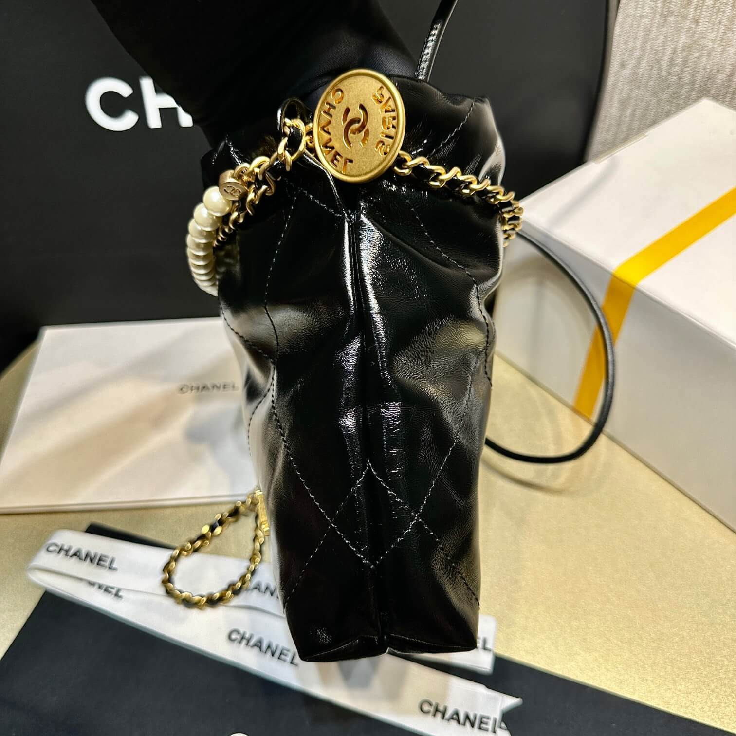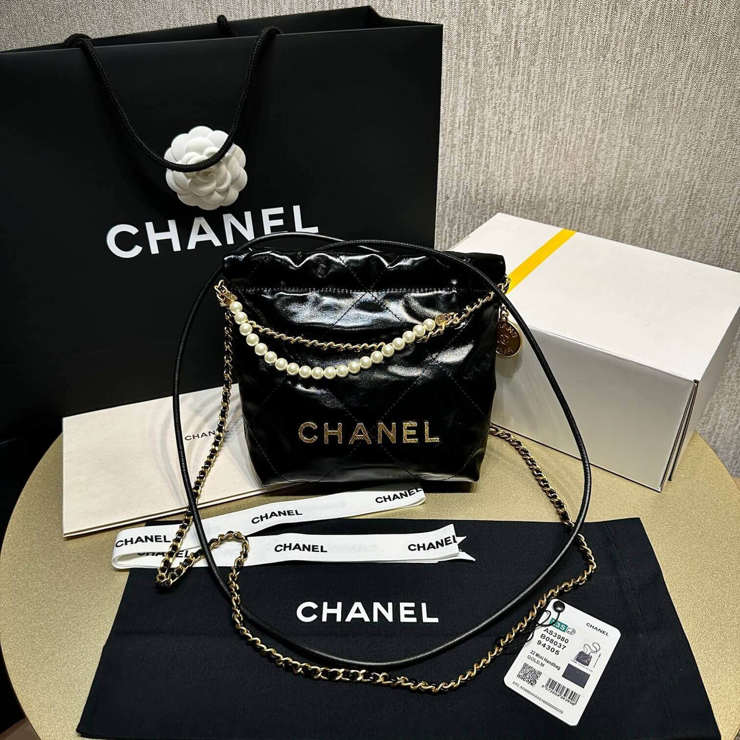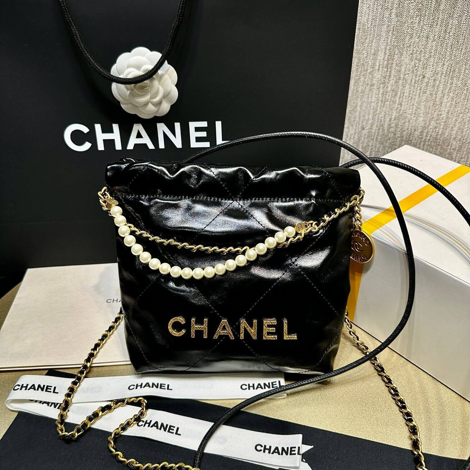 Chanel 22 Mini Bag Shiny Crumpled Calfskin with Pearl Chain AS3980