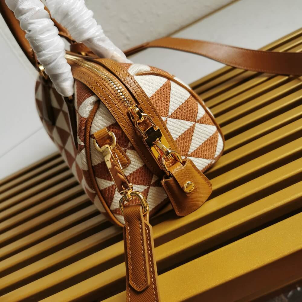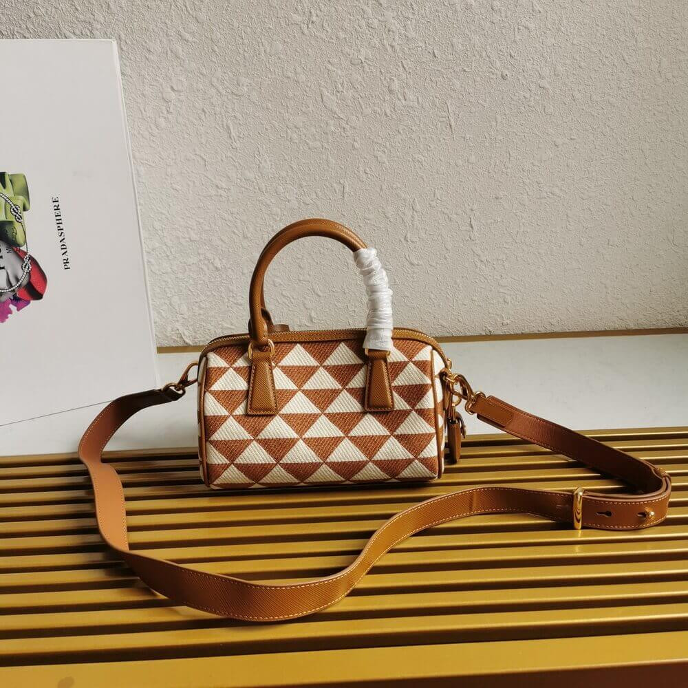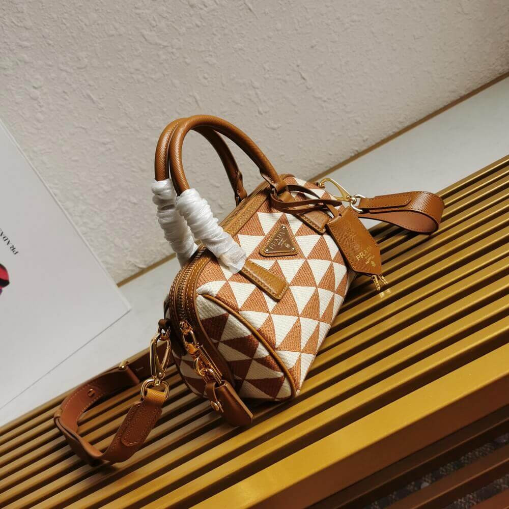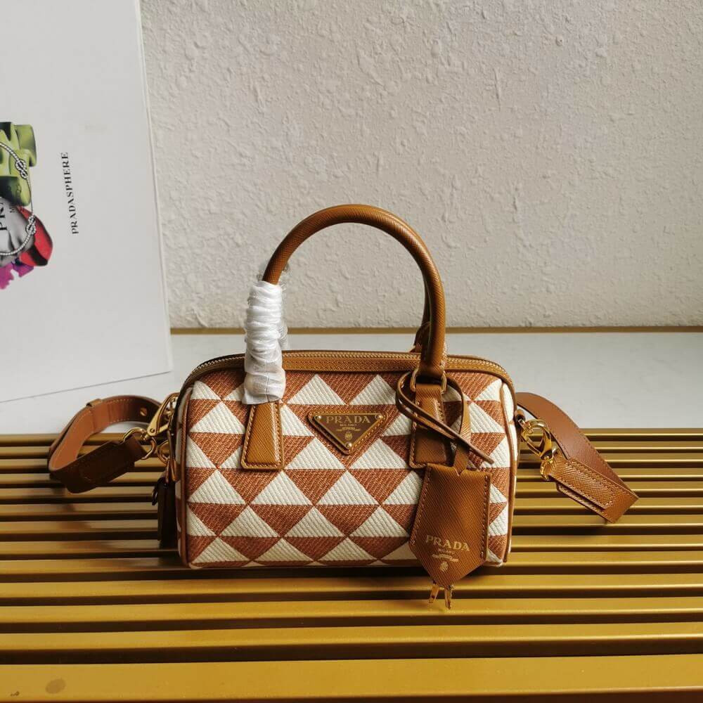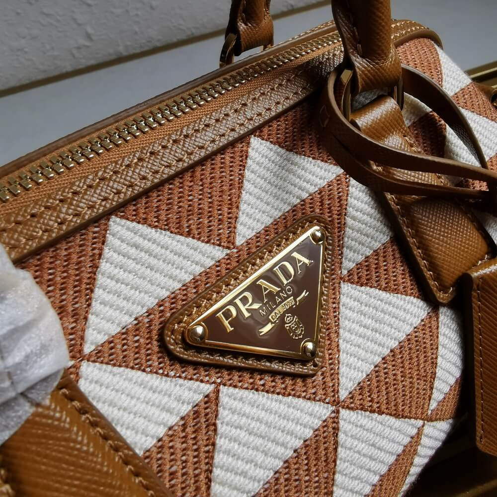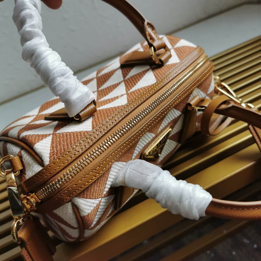Prada Symbole Embroidered Fabric Top-Handle Bag 1BB846 Tobacco/Chalk White