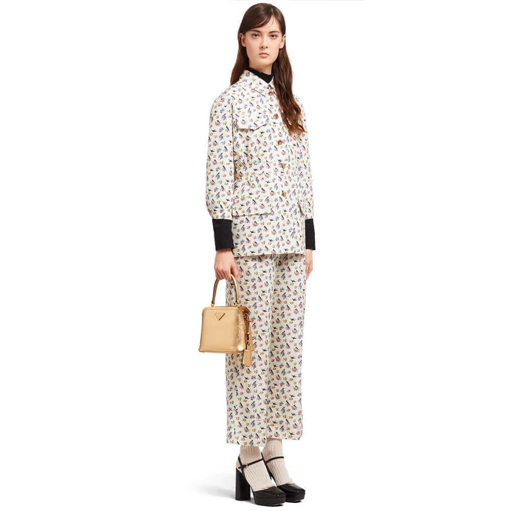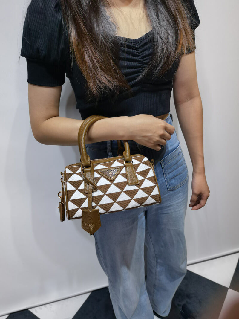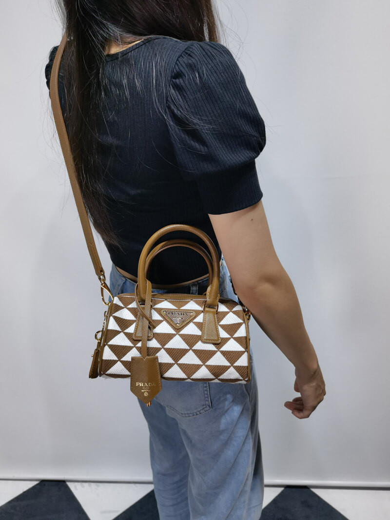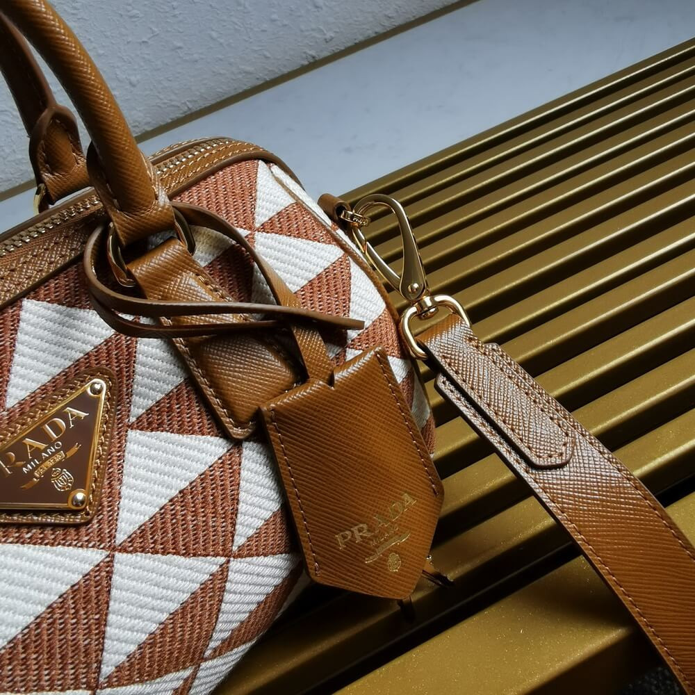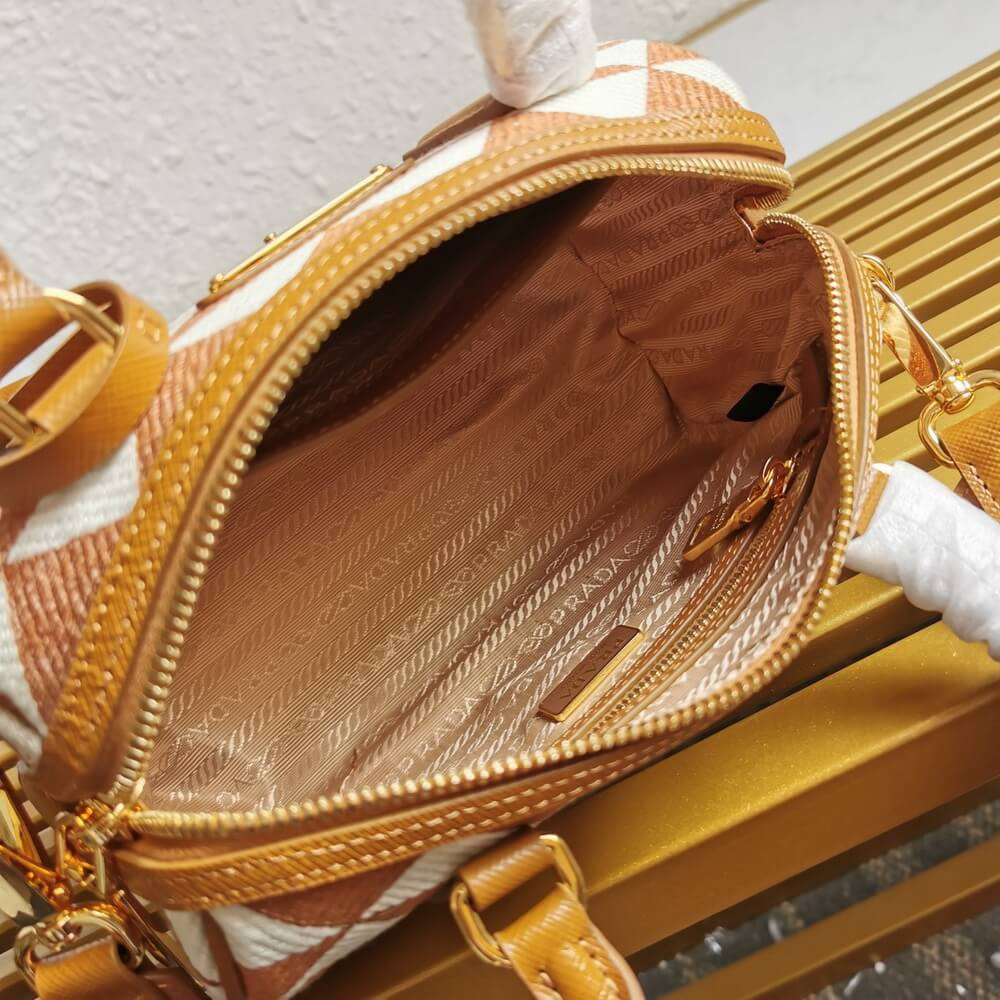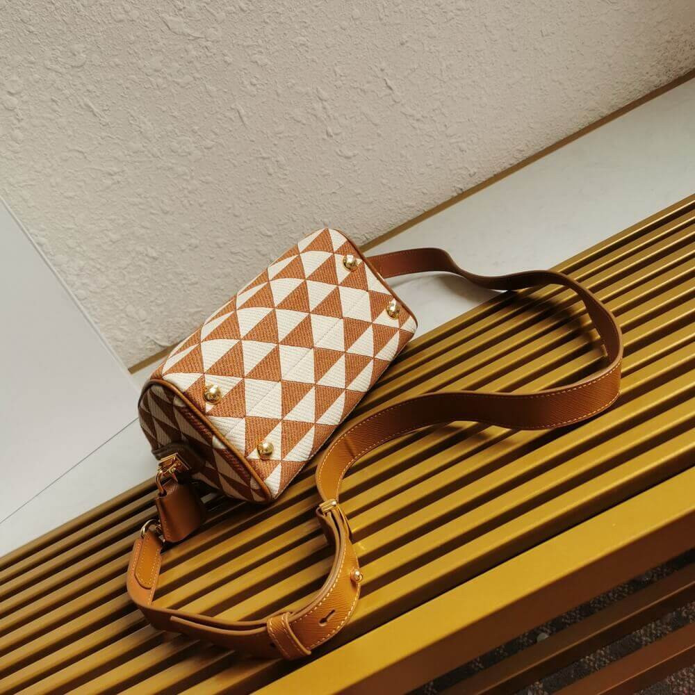 Prada Symbole Embroidered Fabric Top-Handle Bag 1BB846 Tobacco/Chalk White